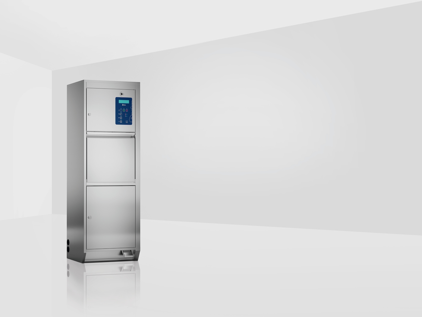 Spoldesinfektor som fristående enhet med automatisk lucköppning och LCD-display.