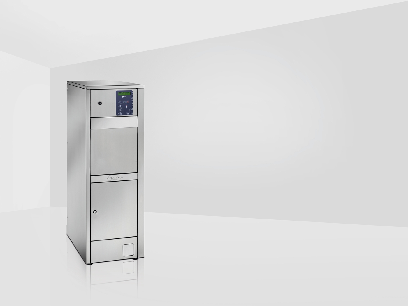Spoldesinfektor som fristående enhet med automatisk lucköppning/-stängning och LCD-display.