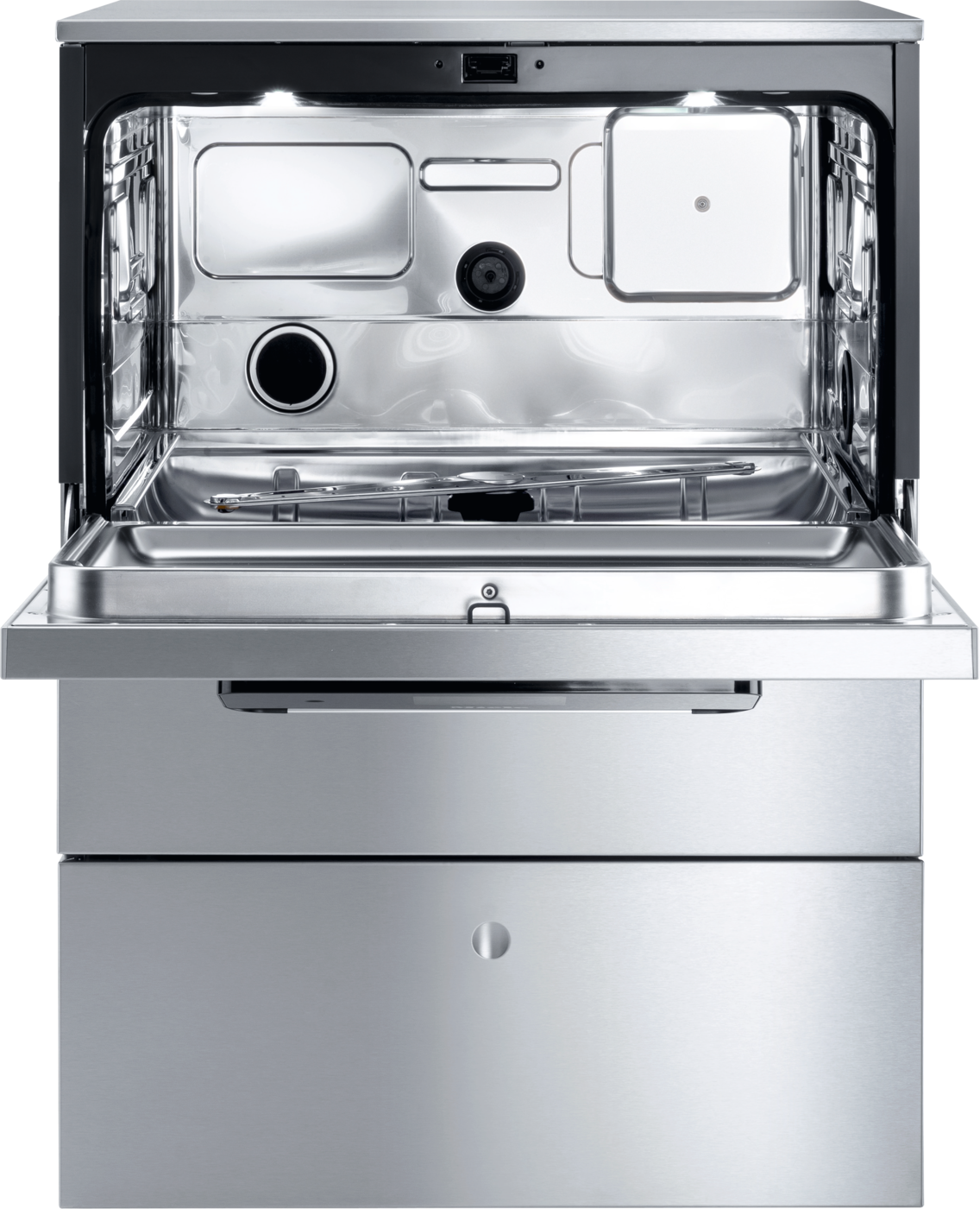 | Värmepump med varierbart varvtal | Själva hjärtat för prickfria resultat Inom de enskilda programblocken har pumpens varvtal och därmed spoltrycket anpassats till de aktuella kraven – högt tryck möjliggör borttagning av svåra föroreningar, medan lågt tryck säkerställer att hela diskgodset blöts. Resultatet är att vatten och energi används extra sparsamt, med ett spoltryck som är optimerat för varje situation. |