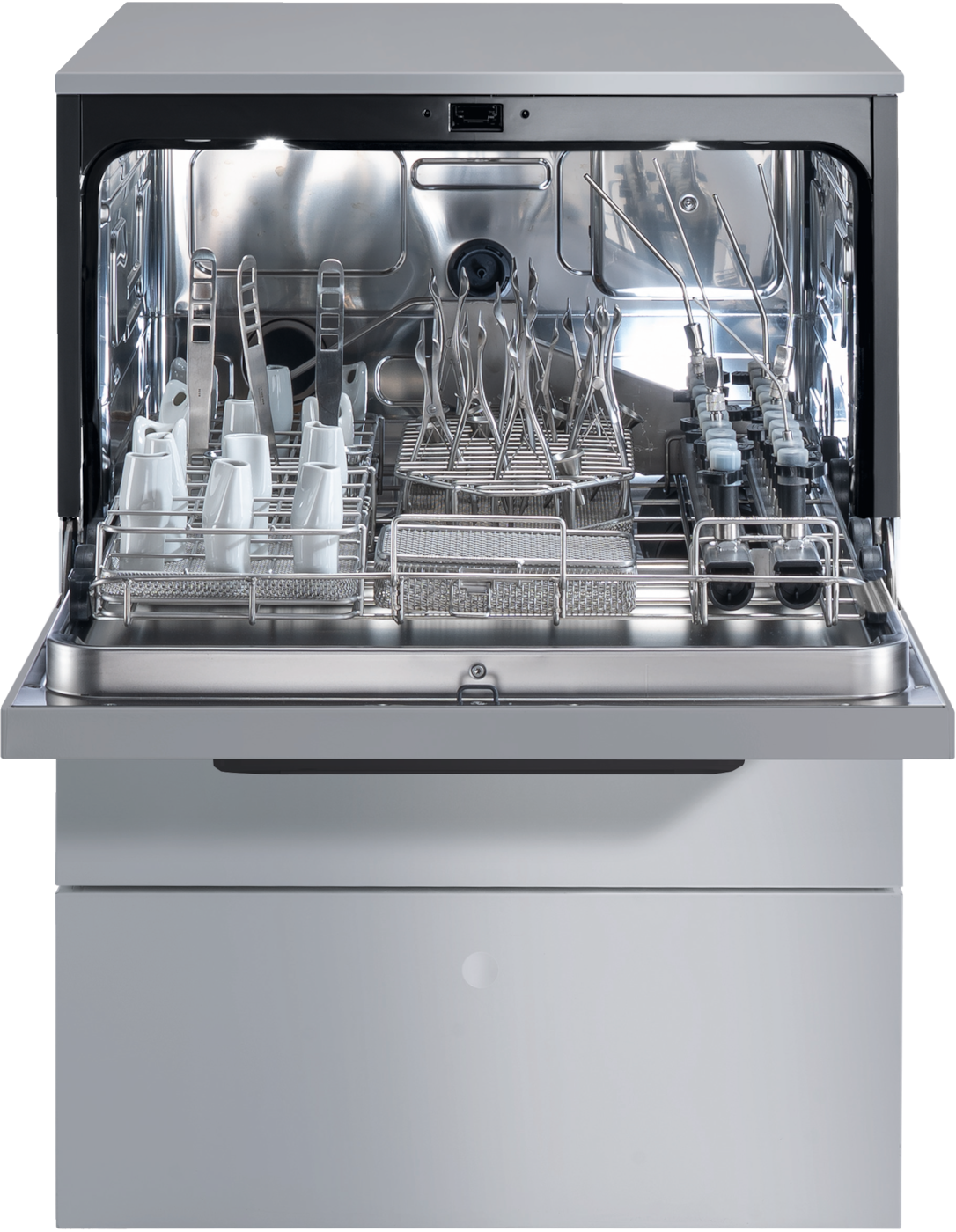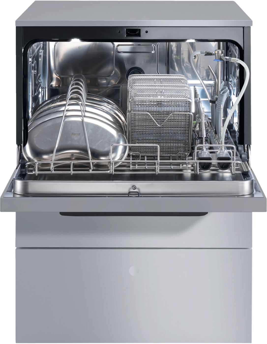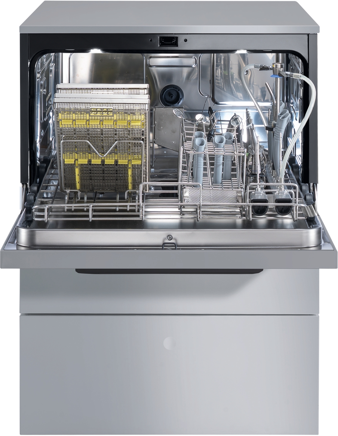 22 roterande instrument kan till exempel rengöras per batch i det korta programmet med en programtid på mindre än 30 minuter. I standardprogrammet kan ytterligare instrument rengöras, till exempel upp till 30 extra dentala universalkanyler (beroende på diameter) i insatsen APWD 062 eller 33 ZEG-spetsar med adaptern A 813/1. - Modern produktdesign med full-touch-display och belysning i diskutrymmetStyrning M Touch Flex