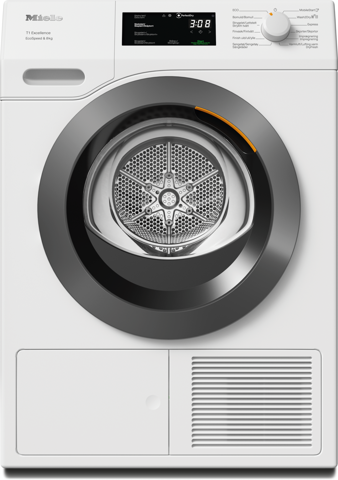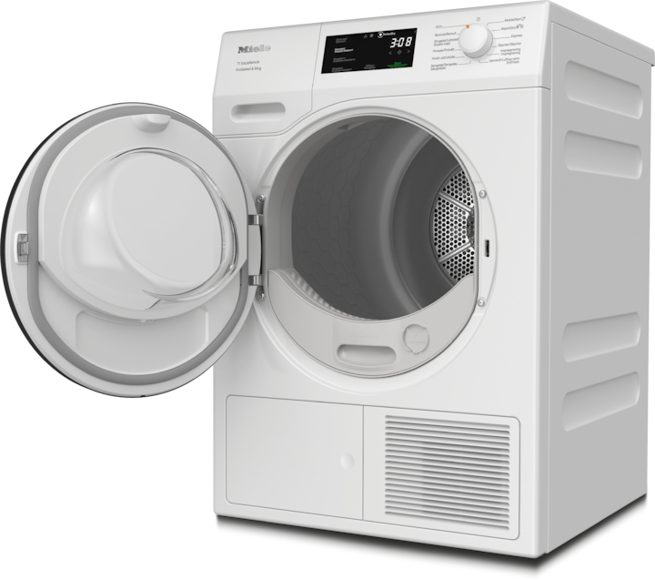 - 7.Tidsbesparing beräknad jämfört med Mieles torktumlare utan EcoSpeed med samma tvättmängd och liknande energieffektivitet. Testat i programmet “Bomull” vid full tvättmängd.