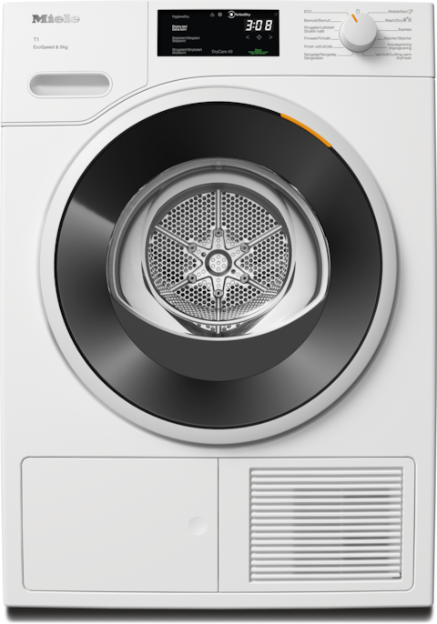 - 8.Tidsbesparing beräknad jämfört med Mieles torktumlare utan EcoSpeed med samma tvättmängd och liknande energieffektivitet. Testat i programmet “Bomull” vid full tvättmängd.